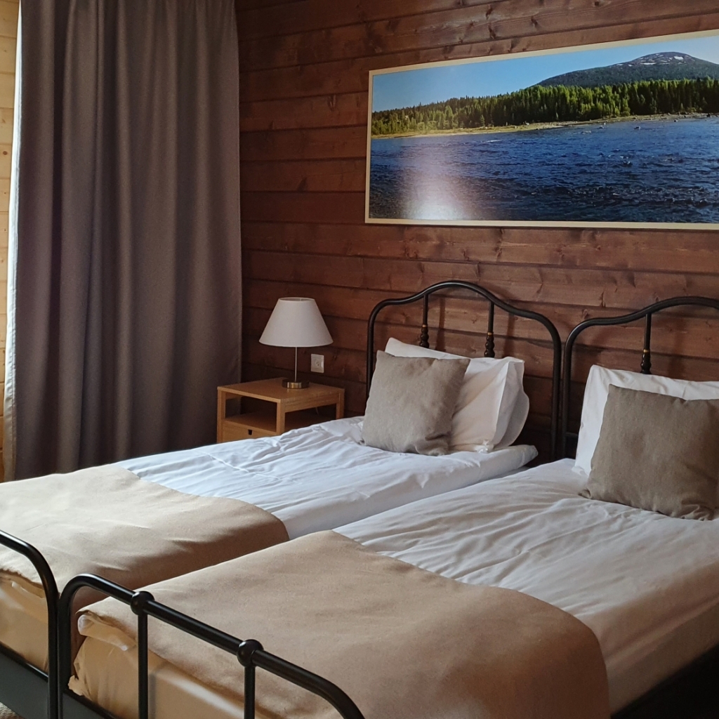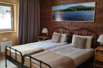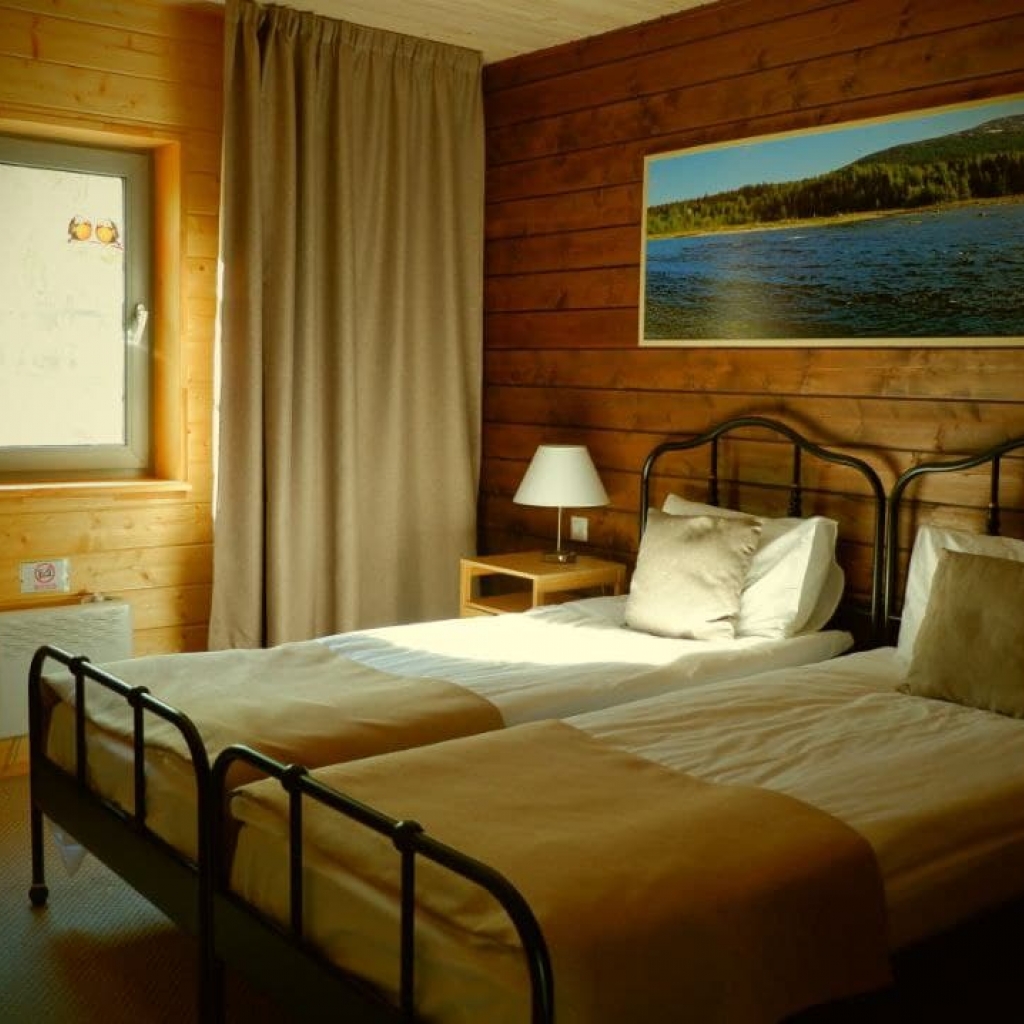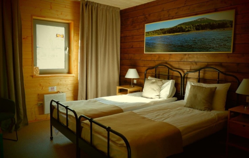 В номере: две односпальные кровати 205x94, две прикроватные тумбочки, письменный стол и стул, платяной шкаф, зеркало, вешалка с багажной полкой.