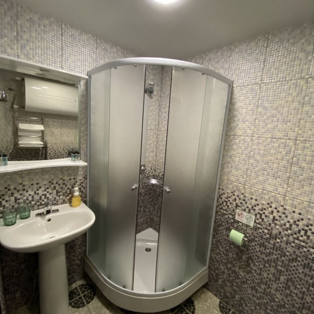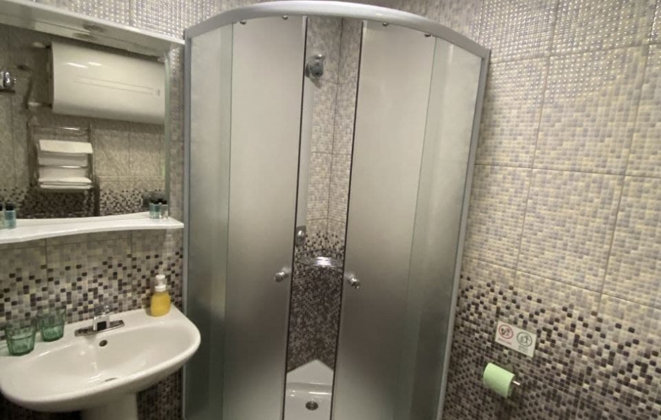- WC, раковина, душевая кабина, фен, два комплекта по три полотенца, туалетные принадлежности.